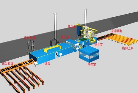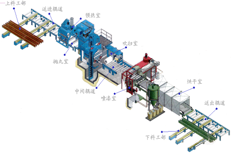 風(fēng)電行業(yè)拋丸機(jī)設(shè)備噴丸工作過程、拋丸機(jī)設(shè)備設(shè)備構(gòu)成及結(jié)構(gòu)說明:1.噴丸房體系統(tǒng);2.丸料回收系統(tǒng);3.分選系統(tǒng);4.噴丸系統(tǒng);5.除塵系統(tǒng);6.風(fēng)機(jī);7.自動(dòng)噴丸系統(tǒng);8. 工件自動(dòng)轉(zhuǎn)動(dòng)系統(tǒng)(包括輸送臺(tái)車);9. 真空吸塵機(jī);10 .電控系統(tǒng)。