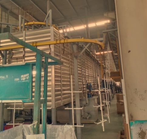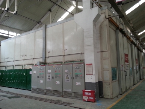 靜電粉體涂裝生產(chǎn)線工藝流程(一) 上件 → 熱水洗 →預(yù)脫脂(60℃) →主脫脂(60℃) →水洗(1) →水洗(2) →酸洗 →水洗(3) →水洗(4) →表調(diào) →磷化(40--45℃,鋁材使用鉻化工藝)→水洗(5) →水洗(6) →純水洗(1) →脫水烘干(120℃) →靜電噴粉系統(tǒng)(含噴粉房、自動噴涂升降往復(fù)機(jī)、靜電發(fā)生器、靜電噴槍、粉桶、小旋風(fēng)粉末回收裝置) →烘干固化(160℃-420℃) →冷卻 →下件