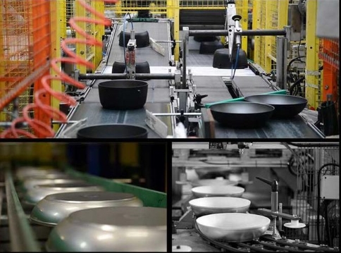鐵氟龍噴涂生產(chǎn)線?主要針對廚具行業(yè)如不粘鍋,電飯鍋內(nèi)膽,刀具,烤盤等等。其主要工藝流程:噴砂前處理 → 吹塵 → 噴底油 → 固化 → 噴面漆 → 燒結(jié) → 冷卻 → 下件。