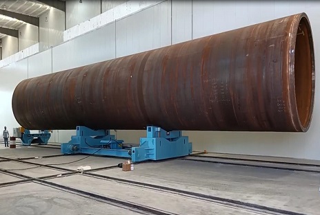 設(shè)備輸送臺車及工件自動轉(zhuǎn)動系統(tǒng) 風(fēng)電塔筒輸送平車 1、風(fēng)電塔筒輸送臺車采用電動鉚鏈牽引自動行走形式。變頻電機(jī)及滑動輪都設(shè)置噴丸室外面的兩端,電機(jī)向前轉(zhuǎn)動時,臺車進(jìn)入噴丸房,后退時,臺車駛出噴丸房。臺車分為兩節(jié),中間以一個電動調(diào)節(jié)轉(zhuǎn)動輪加以連接,通過轉(zhuǎn)動輪的轉(zhuǎn)動