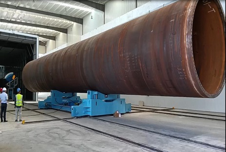 風(fēng)電塔筒拋丸機(jī)設(shè)備用途:該拋丸機(jī)設(shè)備主要是針對目前國內(nèi)外風(fēng)力發(fā)電設(shè)備中的風(fēng)電塔筒內(nèi)外表面拋丸處理專門設(shè)計的。用于自動拋丸清理風(fēng)電塔筒內(nèi)外表面的銹蝕、焊渣、氧化皮、油污等一切污物,使其露出均勻一致的金屬本色,保證表面的清潔度,提結(jié)構(gòu)件與涂料的結(jié)合力