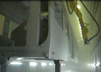 此方式采用機(jī)械(干式)表面前處理,以自動(dòng)機(jī)器人噴砂(丸)室、拋丸機(jī)設(shè)備為工件除銹、除油、改變工件表面粗糙度、增加其表面對(duì)涂料的附著力,然后進(jìn)行噴漆、烘干(此方式為3噴1烘工藝,可根據(jù)實(shí)際情況改為2噴1烘、2噴2烘,工序中4、5為可選工序)。